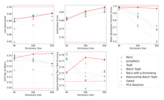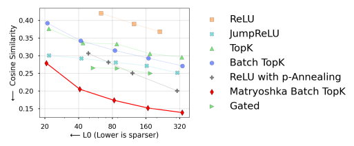 - Matryoshka SAE: increasing size의 nested dictionary를 train하고 smaller dictionary로 input을 reconstruct 시키려는 시도 without using larger dicitonary