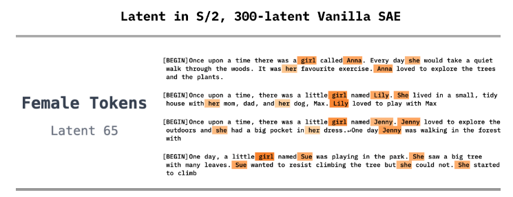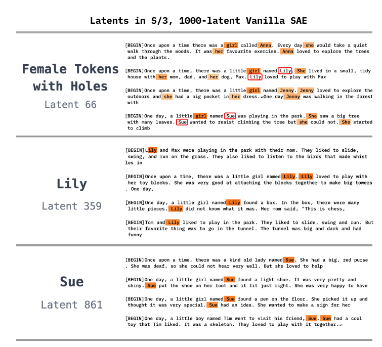 - 원래는 female 관련된 모든 token에 반응하다가 lily, sue 같은 특수한 경우에만 반응하는 latent가 생기고 원래 corresponding latent는 그 경우 반응을 멈춤 ⇒ feature absorption