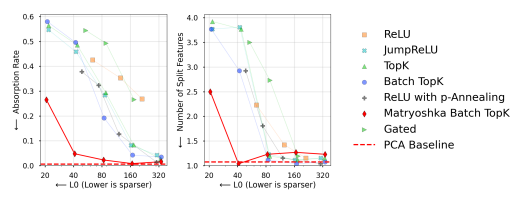- absorption rate 이 가장 낮고 first letter를 capture 하기 위해 activate 되는 feature 개수도 가장 적음을 확인 ⇒ Matryo는 feature splitting이 없음
